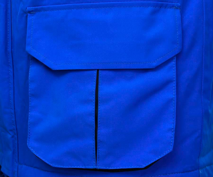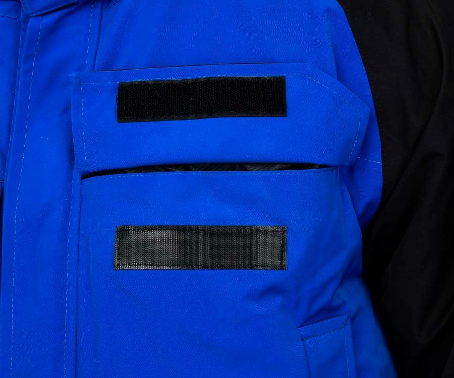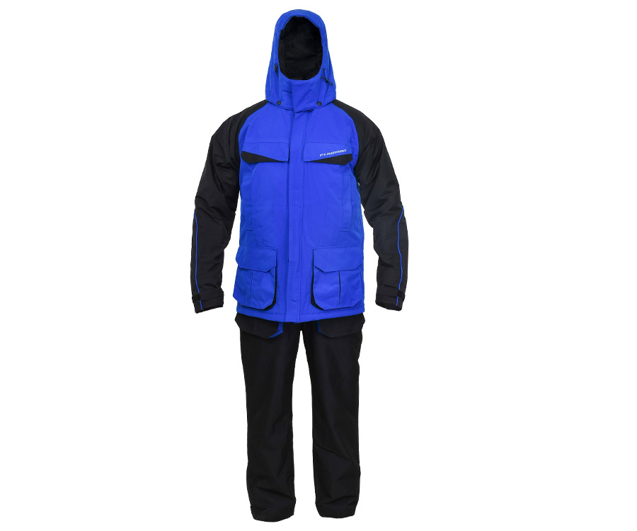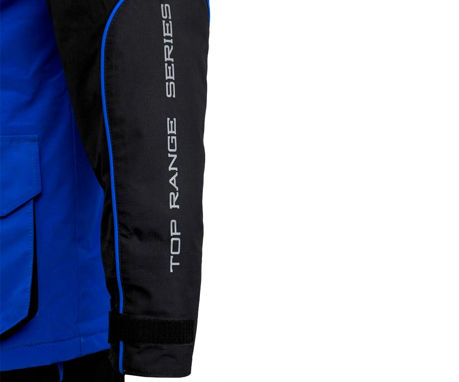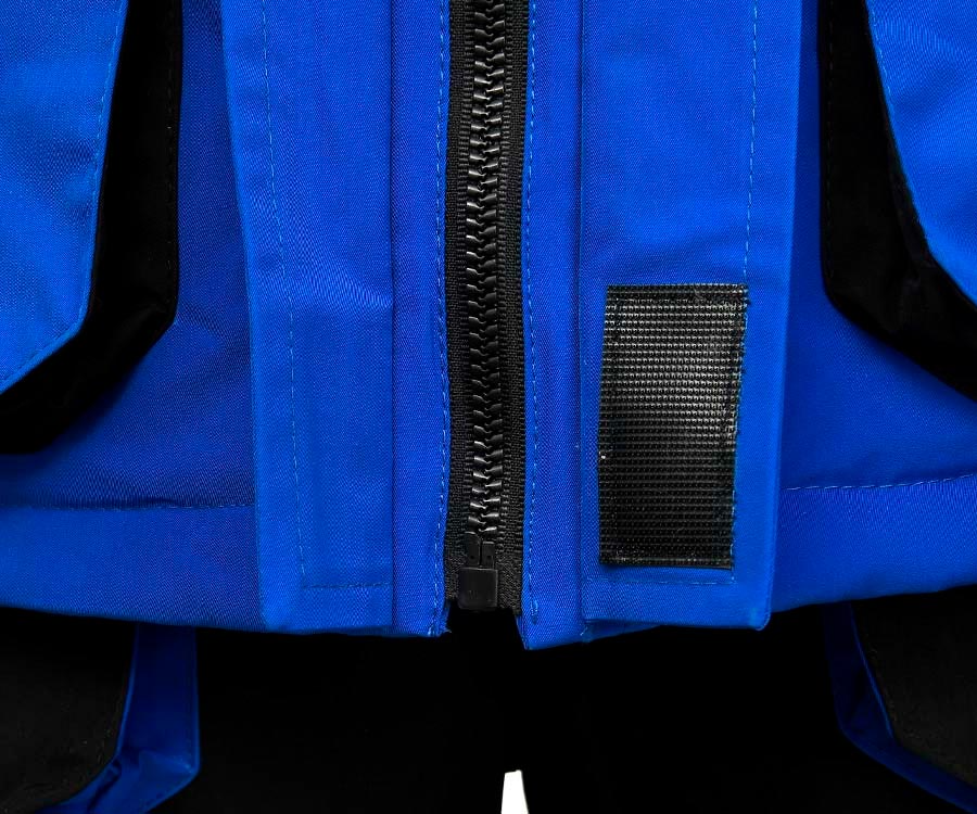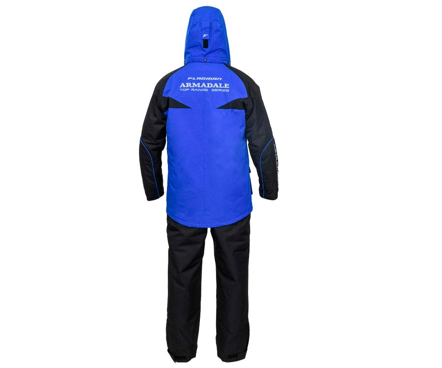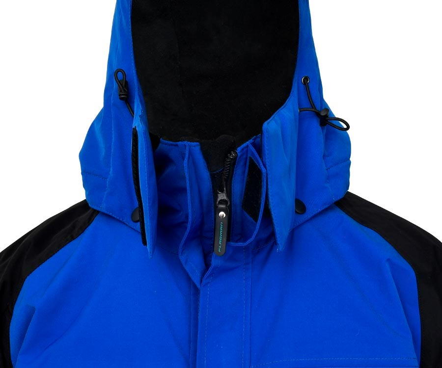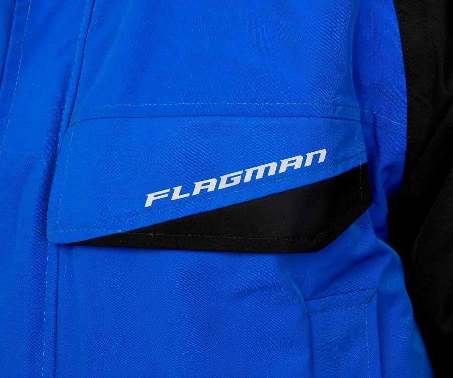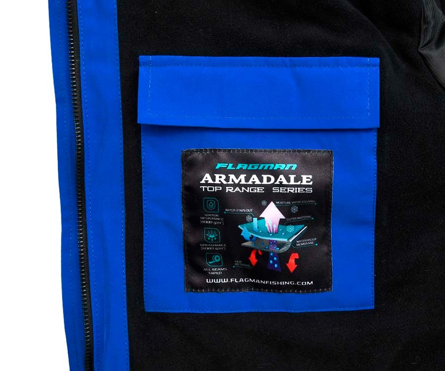 Куртку костюма Flagman Armadale Top Range виконано в стильному чорно-синьому дизайні Armadale. Вона має надійну основну блискавку, яку прикриває клапан на липучках. У куртці з боків є дві зовнішні накладні кишені з клапанами на липучці, дві зовнішні нагрудні кишені з клапанами на липучці, а під ними – ще дві глибокі кишені для зігрівання рук. Крім того, передбачено внутрішню кишеню на липучці – для цінних речей та документів. Краї рукавів – з утяжками на липучці та внутрішніми еластичними манжетами. Передбачено зручне затягування подолу куртки. Високий зручний комір куртки вдало поєднується з капюшоном, що відстібається. Передбачено регулювання капюшону на липучці в потиличній частині та гумові затяжки-фіксатори з боків.